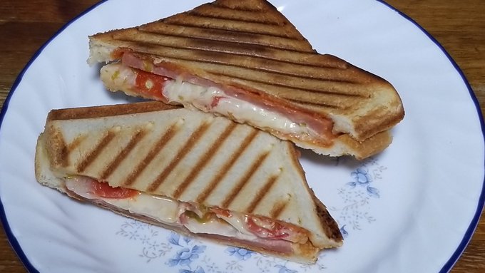 夕食に近い ランチ ホットトーストです 具材は適当に入れました https://pic.twitter.com/1L5fN0emJs